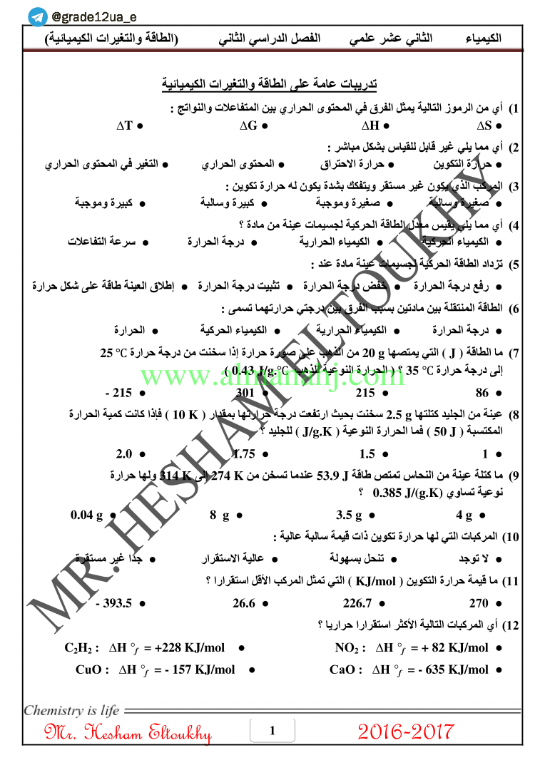 ملخص وأوراق عمل الطاقة والتغيرات الكيميائية كيمياء صف ثاني عشر متقدم فصل ثاني مدرستي الامارتية